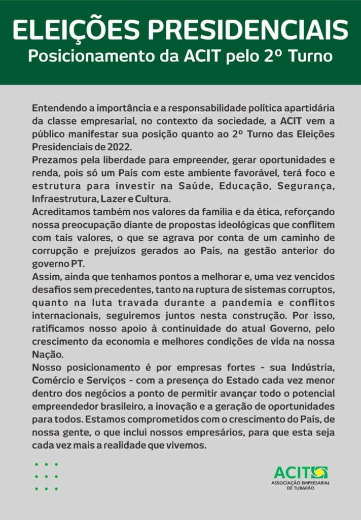 “Entendendo a importância e a responsabilidade política apartidária da classe empresarial, no contexto da sociedade, a ACIT vem a público manifestar sua posição quanto ao 2º Turno das Eleições Presidenciais de 2022.