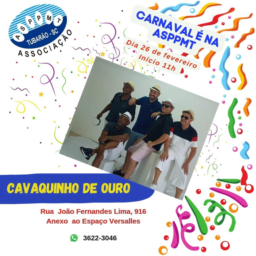 O Carnaval da Associação dos Servidores Públicos de Tubarão (ASPPMT) acontece no dia 26 de fevereiro na sede da associação, que fica anexo ao espaço Versalhes, antiga Sorgitur. O evento tem início às 11h e contará com a atração de Cavaquinho de Ouro.