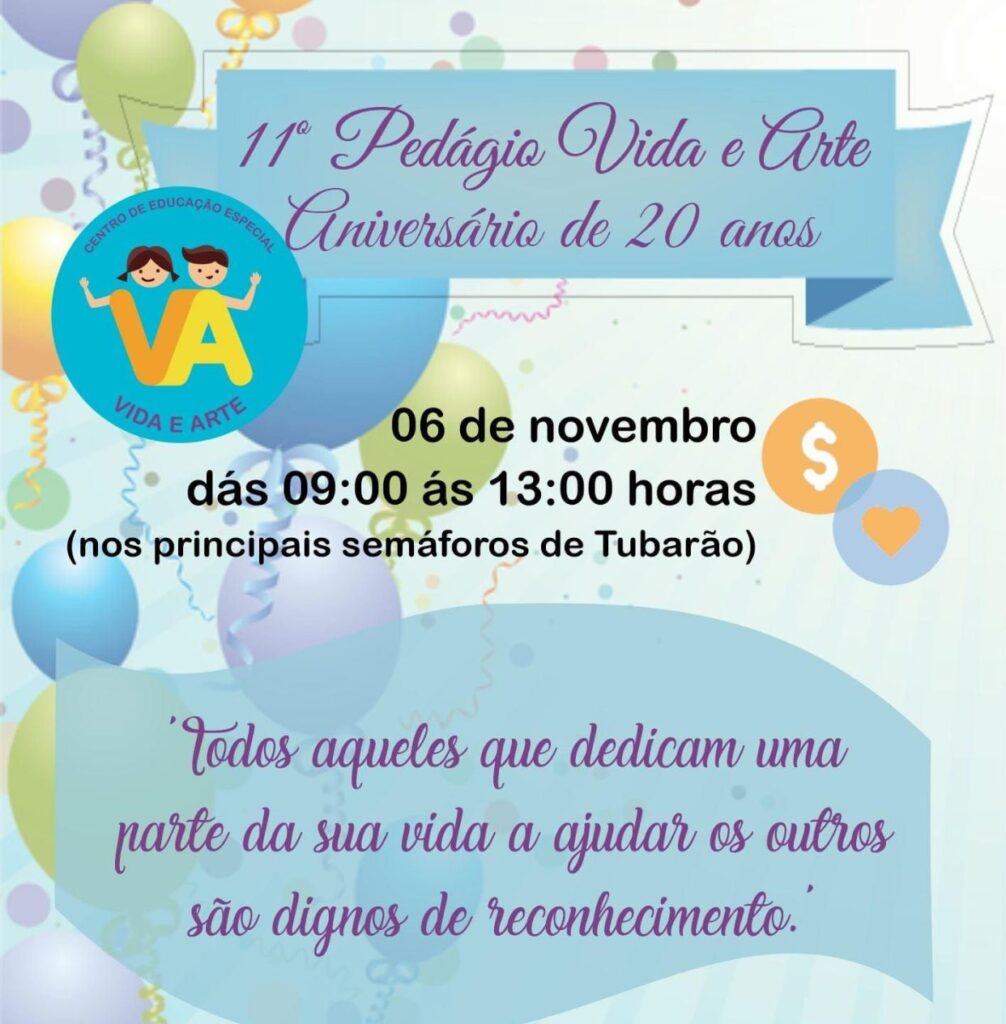 A Associação Vida e Arte de Tubarão completa 20 anos neste sábado (6), e para comemorar realizará um pedágio solidário com o objetivo de angariar recursos que servirão para a manutenção do trabalho da instituição. Ainda há vagas para os desejam se voluntariar. Aos interessados, disponibilizamos telefone para contato: (48) 36268077.