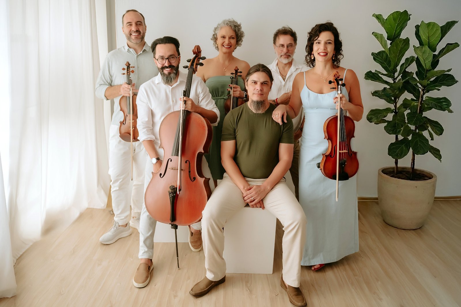 A formação inclui voz, violão, viola de arco, violinos, violoncelo e percussões, criando uma sonoridade ampla e envolvente.