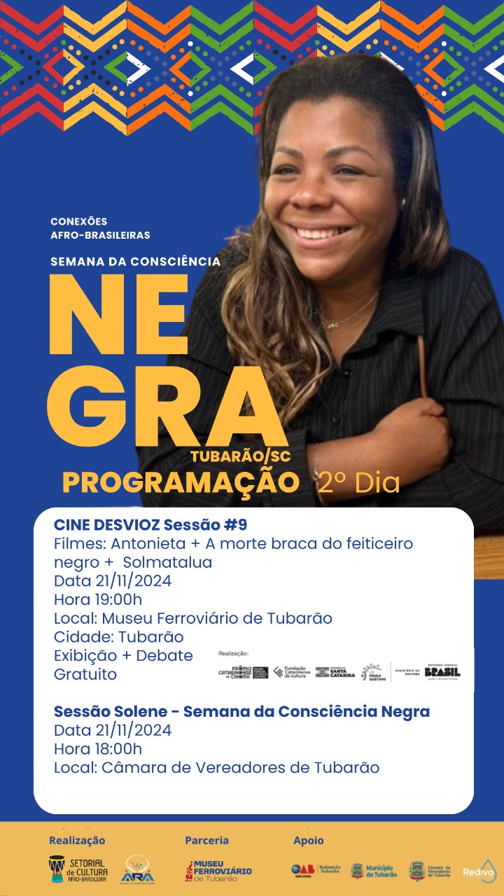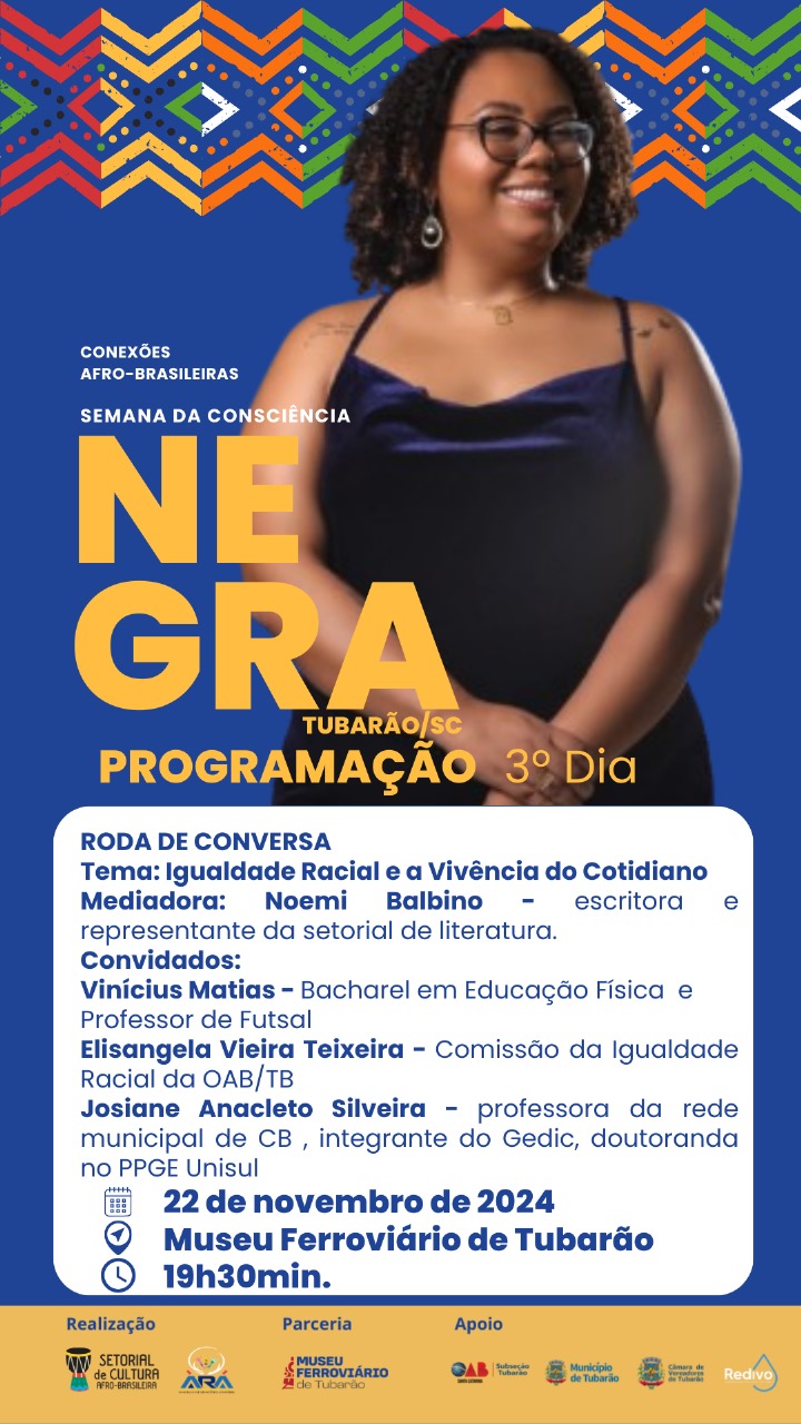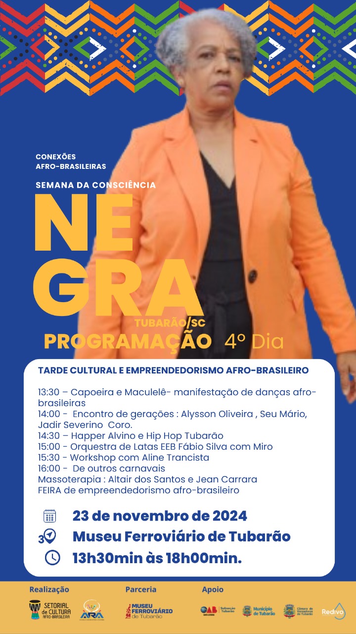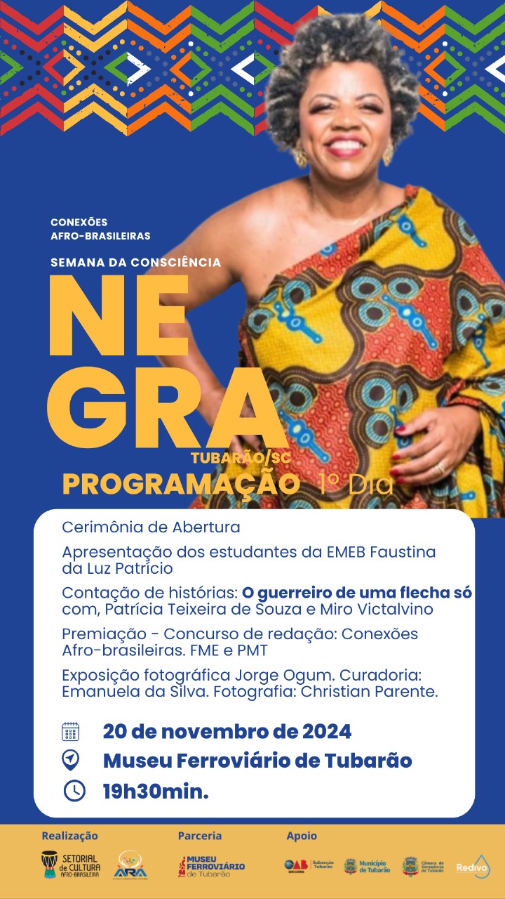 Para destacar a cultura afro-brasileira, uma variada programação foi elaborada pela Setorial de Cultura Afro-Brasileira de Tubarão, em colaboração com a Associação de Resistência Ancestral (ÀRÁ), a Comissão de Igualdade Racial da OAB e o Museu Ferroviário – local onde será o evento.