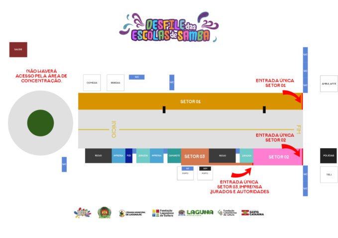 A passarela contará com setores bem definidos, incluindo áreas destinadas ao público em geral, jurados, imprensa, autoridades e recuos técnicos para as baterias das escolas. Ao longo do percurso, serão disponibilizados banheiros químicos, além de pontos de apoio com serviços de saúde, segurança e alimentação.