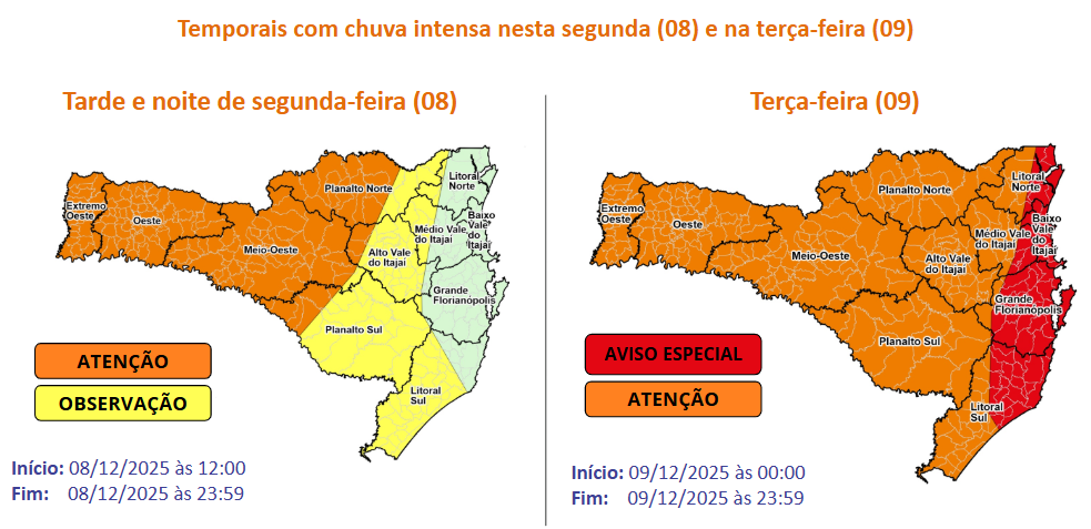 - risco moderado de deslizamentos, especialmente na Grande Florianópolis e no Litoral Sul.
