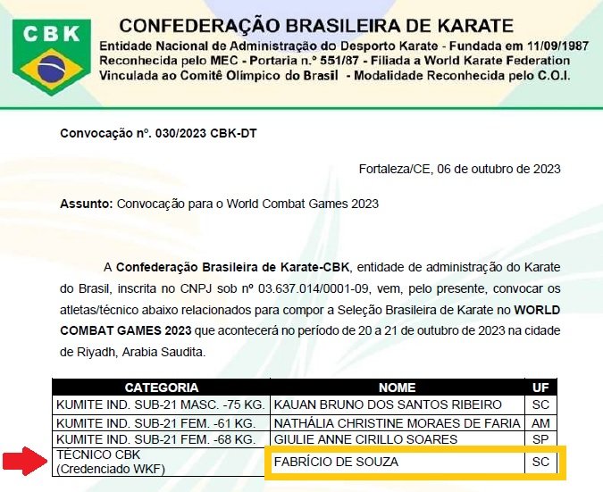 O tubaronense Fabricio de Souza recebeu nesta terça-feira (10) a convocação para ser o técnico do Brasil no World Combat Games 2023, que será realizado em Riyadh, na Arábia Saudita, nos próximos dias 20 e 21.
