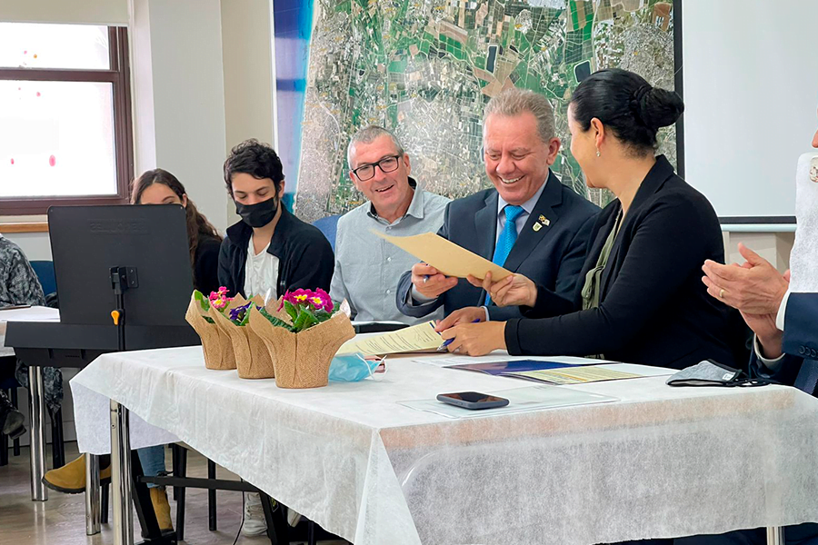 O acordo de cidades-irmãs entre Tubarão e Hefer Valley foi celebrado de maneira presencial nesta sexta-feira (11). O ato foi o primeiro compromisso oficial da missão tubaronense composta pelo prefeito Joares Ponticelli, outros três gestores do município, representantes de entidades e empresários.