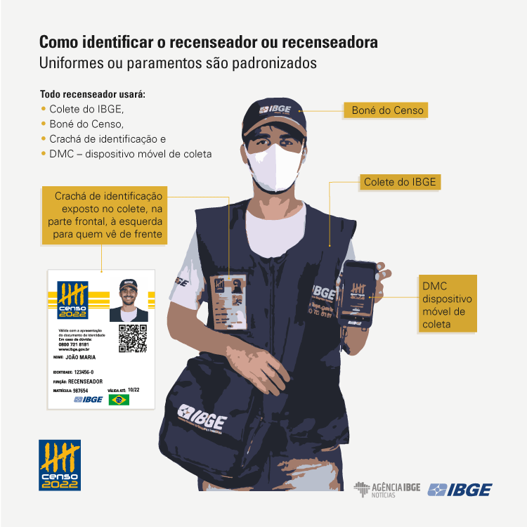 Eles estarão sempre uniformizados, com o colete do IBGE, boné do Censo, crachá de identificação e o DMC. Além disso, é possível confirmar a identidade do agente do IBGE no site Respondendo ao IBGE ou pelo telefone 0800 721 8181. Ambos constam no crachá do entrevistador, que também traz um QR code que leva à área de identificação no site. Para realizar a confirmação, o cidadão deve fornecer o nome, matrícula ou CPF do recenseador.