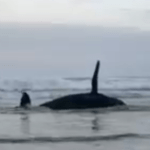 O animal já está encalhado há mais de 24 horas, o que fez com que ficasse debilitado. A baleia é um macho de aproximadamente 11 metros de comprimento.