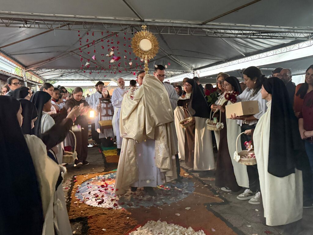 A missa aconteceu na igreja local e foi seguida pela procissão nas ruas do bairro. Com criatividade e devoção, os participantes confeccionaram tapetes com flores, serragem e outros materiais que representavam símbolos religiosos. A estrutura coberta montada ao lado da igreja permitiu que tudo acontecesse como planejado, mesmo com as condições climáticas desfavoráveis.