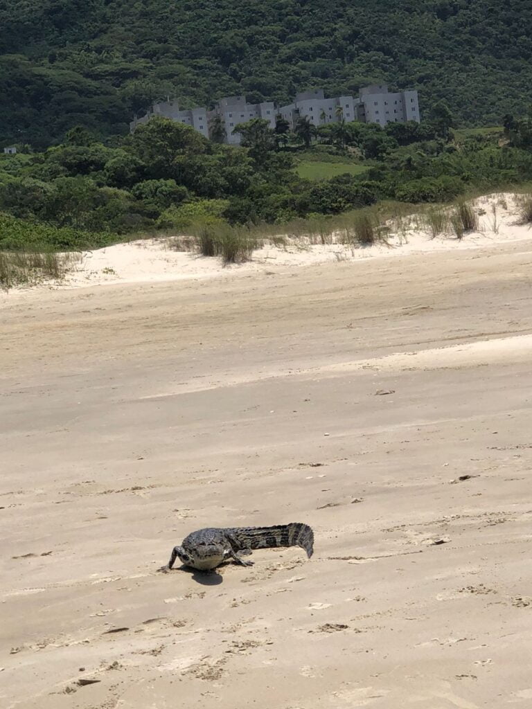 Um jacaré foi encontrado circulando nas areias da Praia da Vila, em Imbituba, no final da manhã desta quinta-feira (10). Ele estava nas proximidades do posto de guarda-vidas do Rimsa.