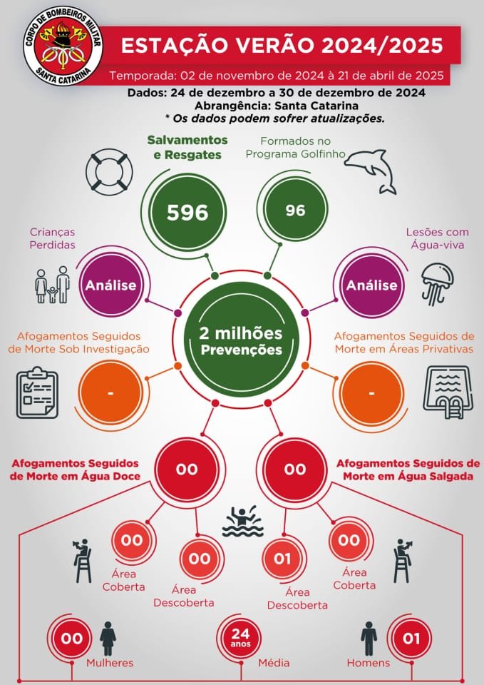 O Corpo de Bombeiros Militar de Santa Catarina (CBMSC) intensificou a atuação nesta temporada de verão e registrou 596 salvamentos por afogamento entre os dias 24 e 30 de dezembro de 2024. A grande movimentação de banhistas, tanto locais quanto turistas, resultou em um alto número de ocorrências, refletindo o aumento do fluxo de pessoas no estado, que recebeu cerca de 3,1 milhões de visitantes nesta temporada.