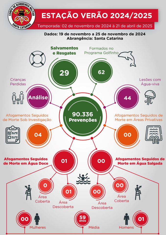 A quarta semana da pré-temporada de verão em Santa Catarina apresentou um saldo positivo no número de salvamentos por afogamento, segundo o relatório atualizado do Corpo de Bombeiros Militar de Santa Catarina (CBMSC). Entre os dias 19 e 25 deste mês, 29 pessoas foram resgatadas com vida nas praias do estado. O número representa uma redução significativa em relação à semana anterior, de 12 a 18 de novembro, quando foram registrados 81 salvamentos.