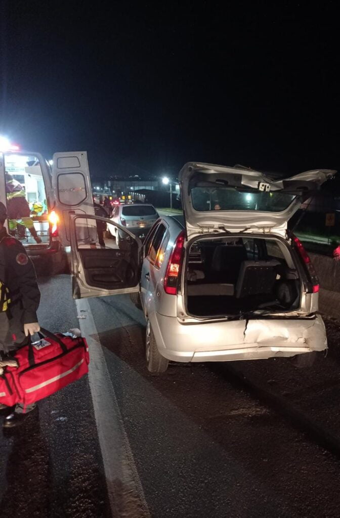 Um acidente de trânsito envolvendo dois carros e uma motocicleta deixou os três motoristas dos veículos feridos na noite desta segunda-feira (18), em Capivari de Baixo. A batida foi registrada por volta das 19h, na BR-101, próximo ao viaduto de acesso ao município.