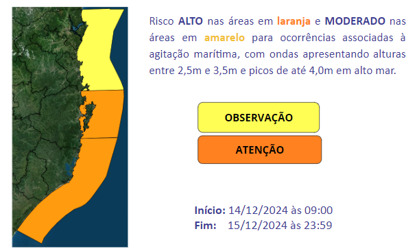 Outro ponto de preocupação é o mar agitado entre o Litoral Sul e a Grande Florianópolis, onde há risco alto para ocorrências relacionadas à ressaca. Ondas entre 2,5 m e 3,5 m são esperadas nessas regiões, com picos de até 4 m em alto-mar. No Litoral Norte, as ondas variam entre 2 m e 2,5 m. A agitação diminui gradativamente no domingo (15), conforme o sistema de baixa pressão se afasta para o oceano.