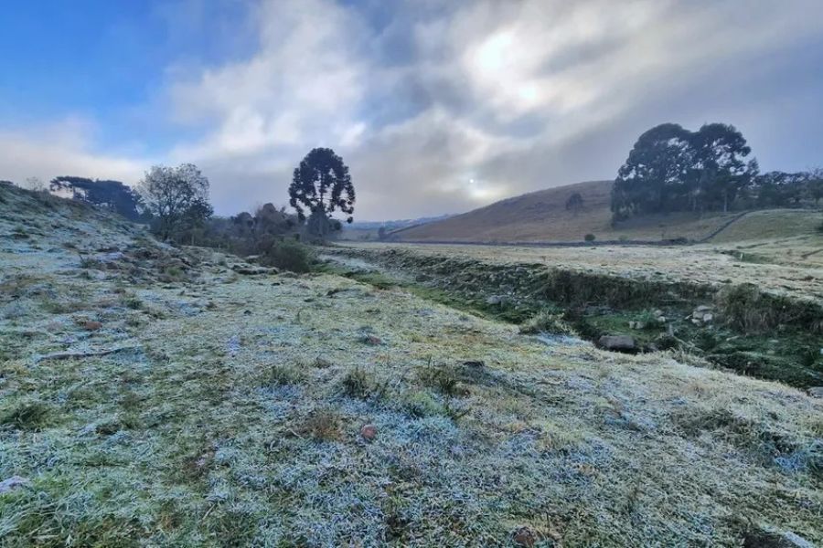 A Serra de Santa Catarina continua a enfrentar um intenso período de frio, com a ocorrência de geada e temperaturas abaixo de 0ºC pelo terceiro dia consecutivo. Na manhã desta segunda-feira, os termômetros marcaram mínimas geladas em diversas localidades da região, deixando a paisagem coberta por uma camada de gelo brilhante.