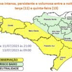 No período de sexta-feira a sábado, o risco é alto para inundações, enxurradas e alagamentos nas bacias hidrográficas das regiões do Litoral Norte, Litoral Sul, Vale do Itajaí e Grande Florianópolis e muito alto para inundações, enxurradas e alagamentos nas bacias hidrográficas das regiões do Grande Oeste, Planalto Norte e Planalto Sul.