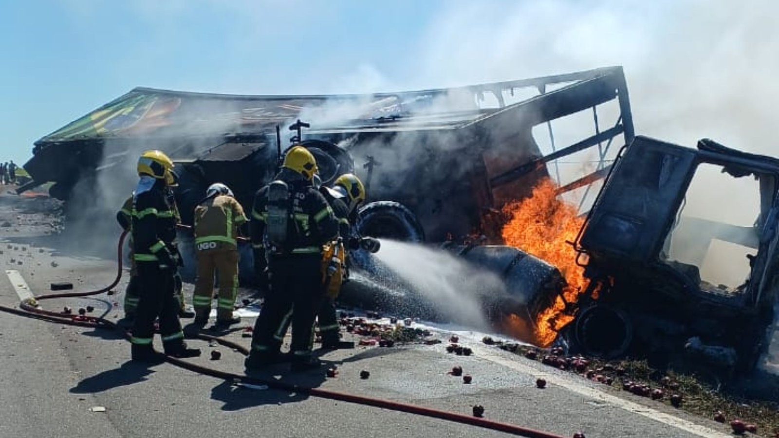 Uma carreta carregada com cebolas tombou e foi tomada pelo fogo na tarde desta quarta-feira (17) na BR-101, no trecho entre os municípios de Sangão e Jaguaruna. O acidente ocorreu por volta das 14h20 e, apesar do impacto e do incêndio, não houve registro de feridos. Os prejuízos foram apenas materiais.